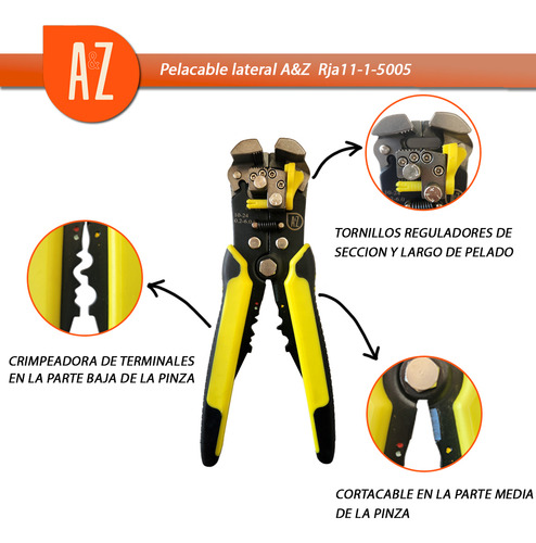 La Pinza Pelacable Lateral Ajustable Automática RJA11-1-5005 de la marca AZ es una herramienta imprescindible para electricistas y aficionados al bricolaje. Este pelacables automático cuenta con un mando ajustable que permite pelar cables de diferentes calibres, desde 1 mm hasta 6.0 mm, lo que la convierte en una opción versátil para diversas aplicaciones. Además, su regulador de filamentos asegura un corte preciso y eficiente. No solo es ideal para el pelado de cables, sino que también incluye una función de crimpadora, facilitando la colocación de terminales. Diseñada con un mango antideslizante, proporciona un agarre seguro durante su uso. Con un peso de 492 g y dimensiones compactas, esta herramienta es fácil de manejar y almacenar. El embalaje adicional protege su integridad, garantizando que recibas un producto de alta calidad. Descubre la comodidad y funcionalidad de esta útil pinza pelacable en tu próximo proyecto.