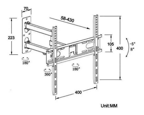 Presentamos el Soporte para Pared TV / Monitor Modelo TV1008, ideal para pantallas de 26 a 55 pulgadas, brindando una solución robusta y versátil para tu entretenimiento. Este soporte cuenta con un brazo extensible de alta calidad que permite un ajuste preciso, ofreciendo un ángulo de inclinación de -5º hasta 8º y un movimiento lateral de hasta 180º, garantizando la mejor visualización desde cualquier posición. Compatible con pantallas LED y con una capacidad de soporte de hasta 50 kg, es perfecto para espacios de juegos y cine en casa. Su diseño negro moderno se integra fácilmente en cualquier decoración. Con un rango de distancia a la pared de 60 a 410 mm, se adapta a tus necesidades de espacio mientras que los estándares VESA de 200×200 y 400×400 aseguran una instalación sencilla y segura. ¡Mejora tu experiencia visual con el soporte TV1008!